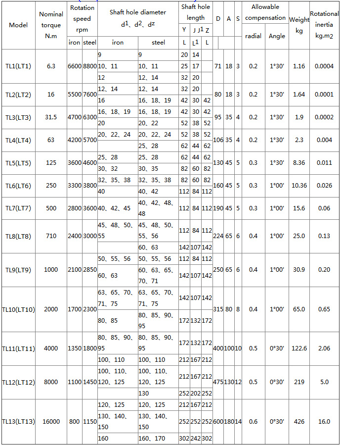 TL (LT) type elastic sleeve pin coupling characteristics and application: it has a certain compensation for the relative offset of the two axes and damping, buffering performance, simple structure, easy to manufacture, no lubrication, convenient maintenance, large radial size It is suitable for the shaft of the installation base with good rigidity, high precision of alignment, small impact load and low requirements for vibration reduction. It has wide application range and is the earliest universal standard coupling in China. Not suitable for high speed and low speed heavy duty conditions.